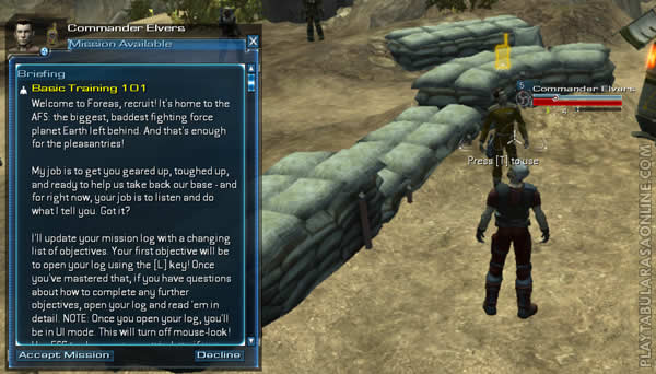 You should have figured out by now that the crosshair in the center of your screen is where your character is looking at. It is used to target things for shooting as well. Look at the NPC with the radio above his head (Commander Elvers); a triangle should appear around him that says "Press [T] to use" below it.