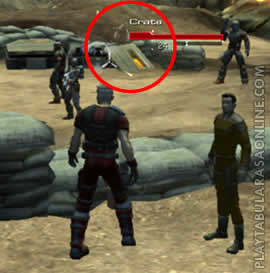 Shoot the crate till it blows up. To unholster your weapon, either press the fire weapon mouse button (default mouse button 1) or press "H". To fire your weapon, press the fire weapon mouse button. It will take a couple of hits before the crate explodes. You will also notice the "HP" or Health Points of the crate is graphically represented by the red bar under its name. Once the entire bar goes from bright red to dark red, that means the target is dead. Your character's HP bar is at the bottom left of the screen. Unlike the crate, you have shielding. Shielding is represented by the greyish-blue bar above the HP bar. Once this is depleted, your HP bar wil lstart dropping and once your HP bar is gone, you're dead.
