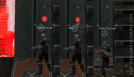 Further up ahead, you will stumble accross an AFS Turret that has been captured by the Bane. You can shoot at it from a distance instead of using your charges to take it out. After you take the turret out, move on forward and you will encounter a red gate. A red gate means that the outpost is in enemy hands, and you need to recapture the point. There is another AFS Turret on the left side of the gate. Take it out and proceed to the red gate, but watch for Bane units.